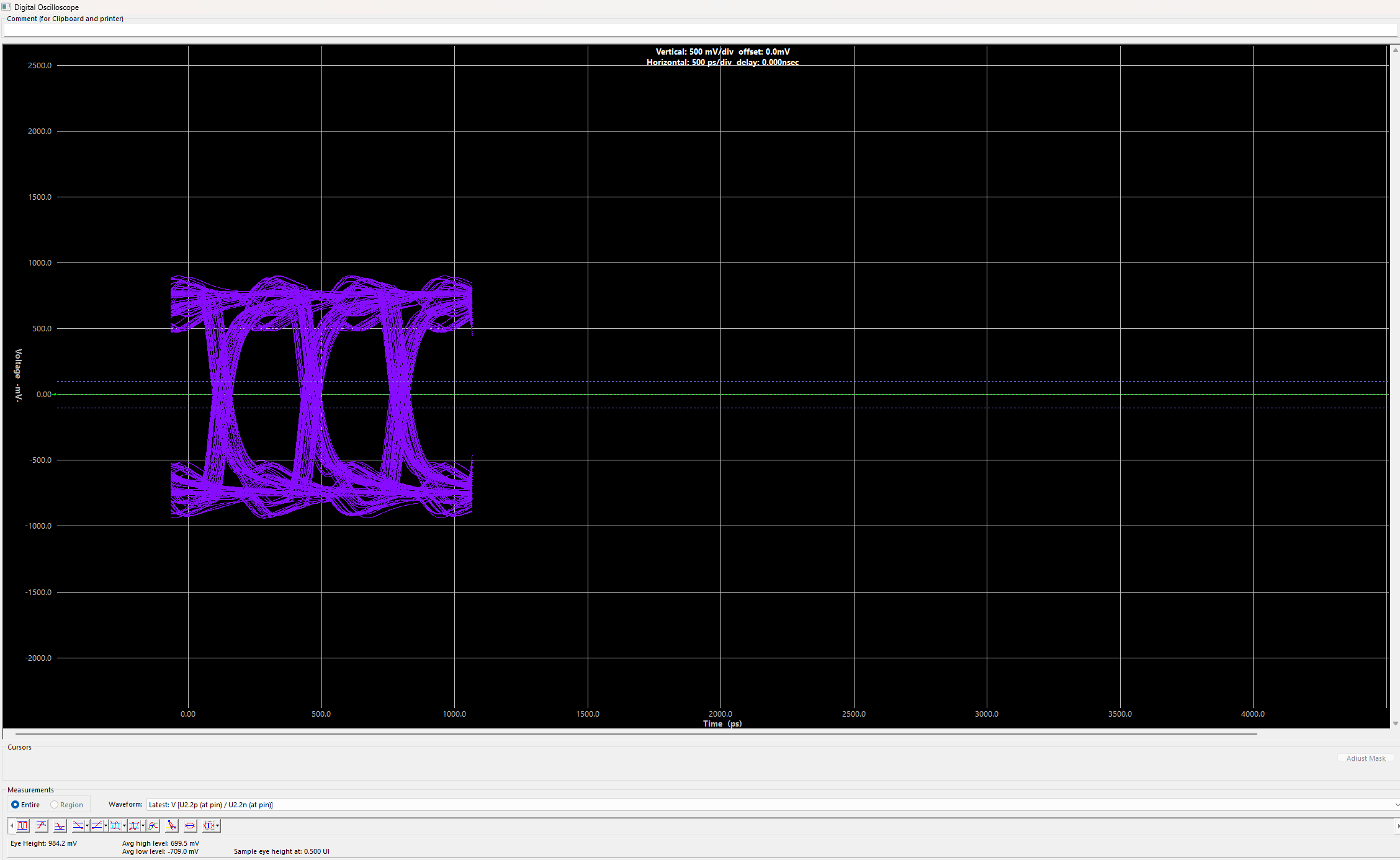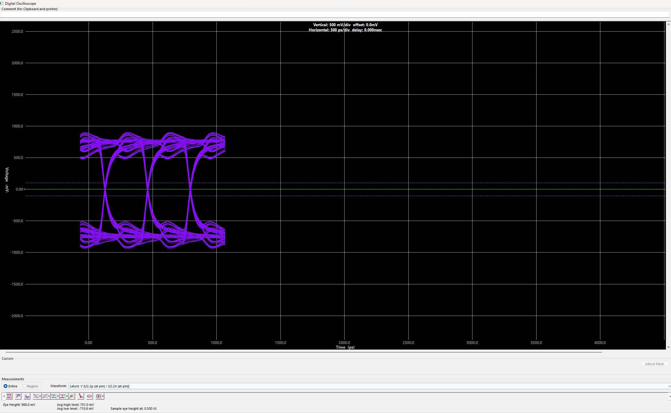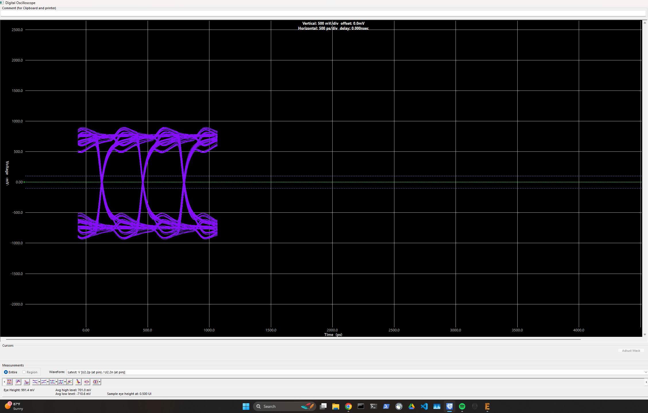 For this mini-project, I designed a simple high-speed transmission line circuit in HyperLynx, and simulated an eye diagram at the receiver at the end of the line. My main goal was to familiarize myself with HyperLynx and simulating signal integrity with Eye Diagrams. I first simulated the circuit with no added jitter. Then, I added two types of jitter as I simulated the circuit. The first simulation comprised of added Gaussian jitter, and the second simulation had both Gaussian and Sinusoidal jitter. The resulting eye diagrams are: No Added Jitter, Added Gaussian Jitter, Added Gaussian and Sinusoidal Jitter.