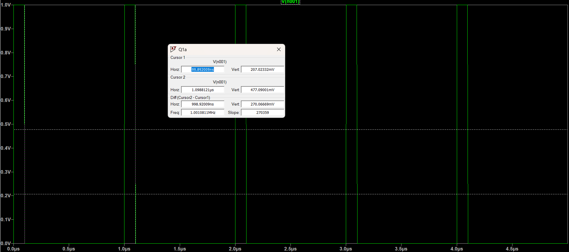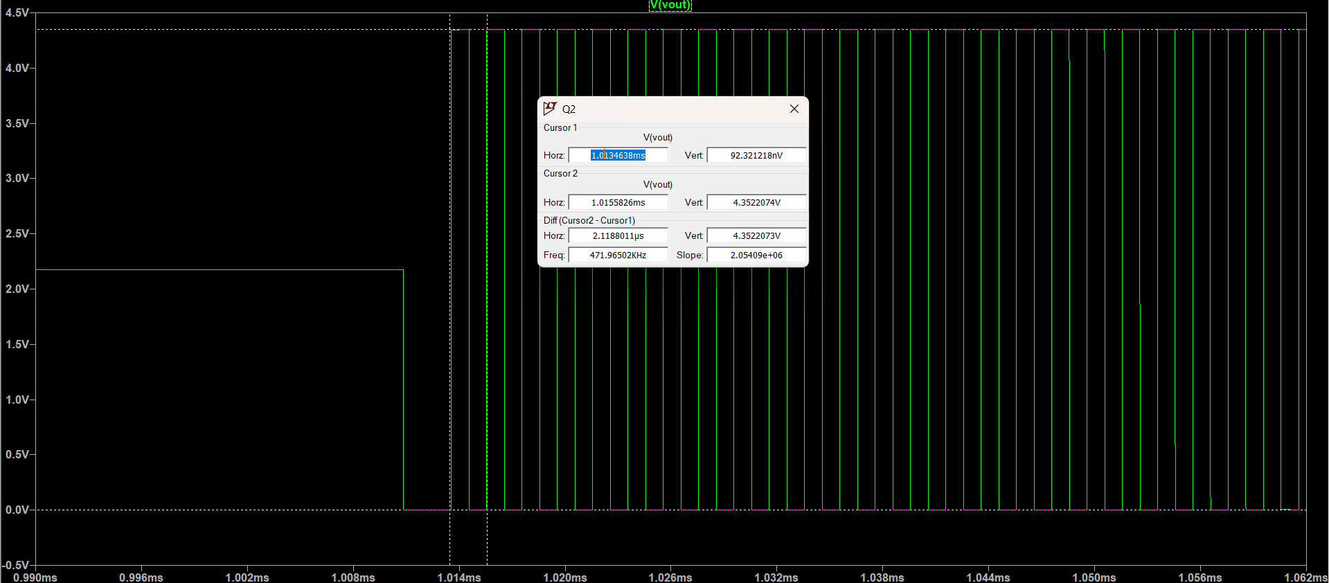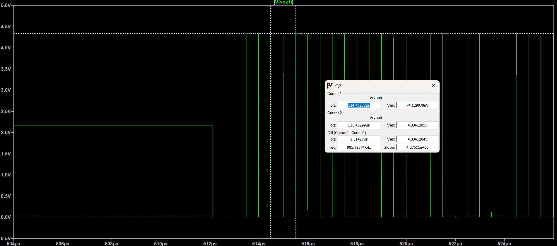 This phase detector takes in two square wave inputs and outputs a set of short pulses where the two inputs differ in phase. As shown in the circuit schematic, one of the square wave inputs is delayed behind the other, thus allowing the phase detector circuit to output the different in phase as a pulse train. This circuit was simulated in LTSpice to verify the circuit works as intended, and the simulated wave form is as follows: Phase Detector Output.